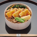 富山のブランド豚『立山ポーク』を使用した角煮と、甘辛く炊いた牛すき煮を贅沢に盛付けたわっぱ飯です